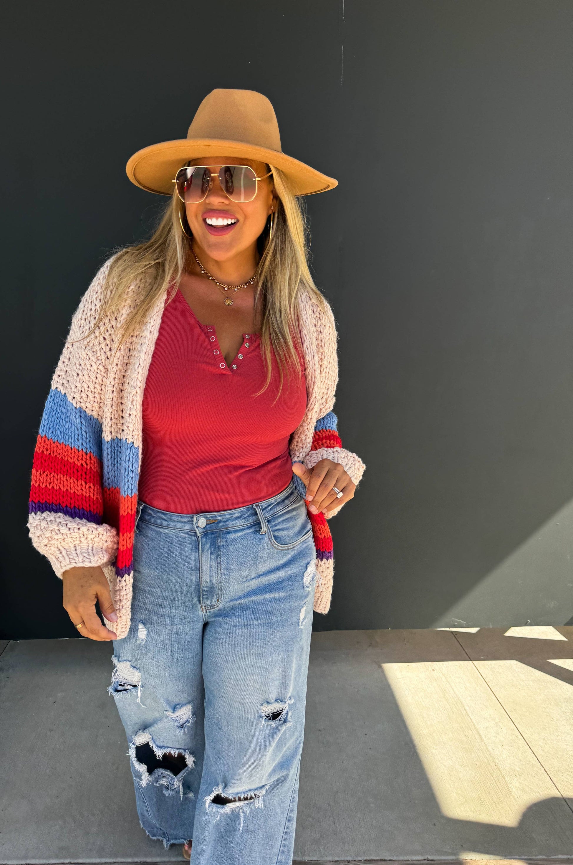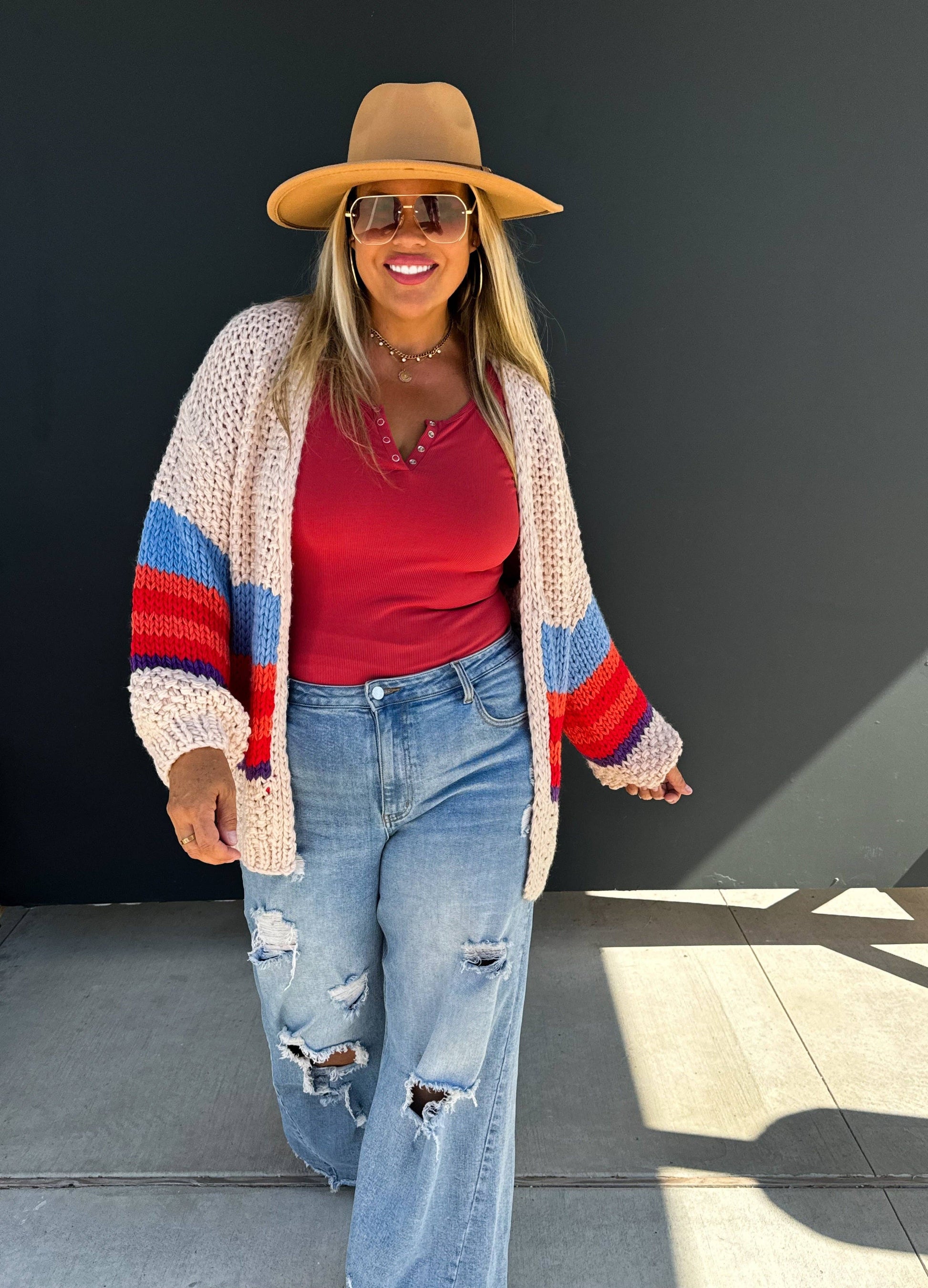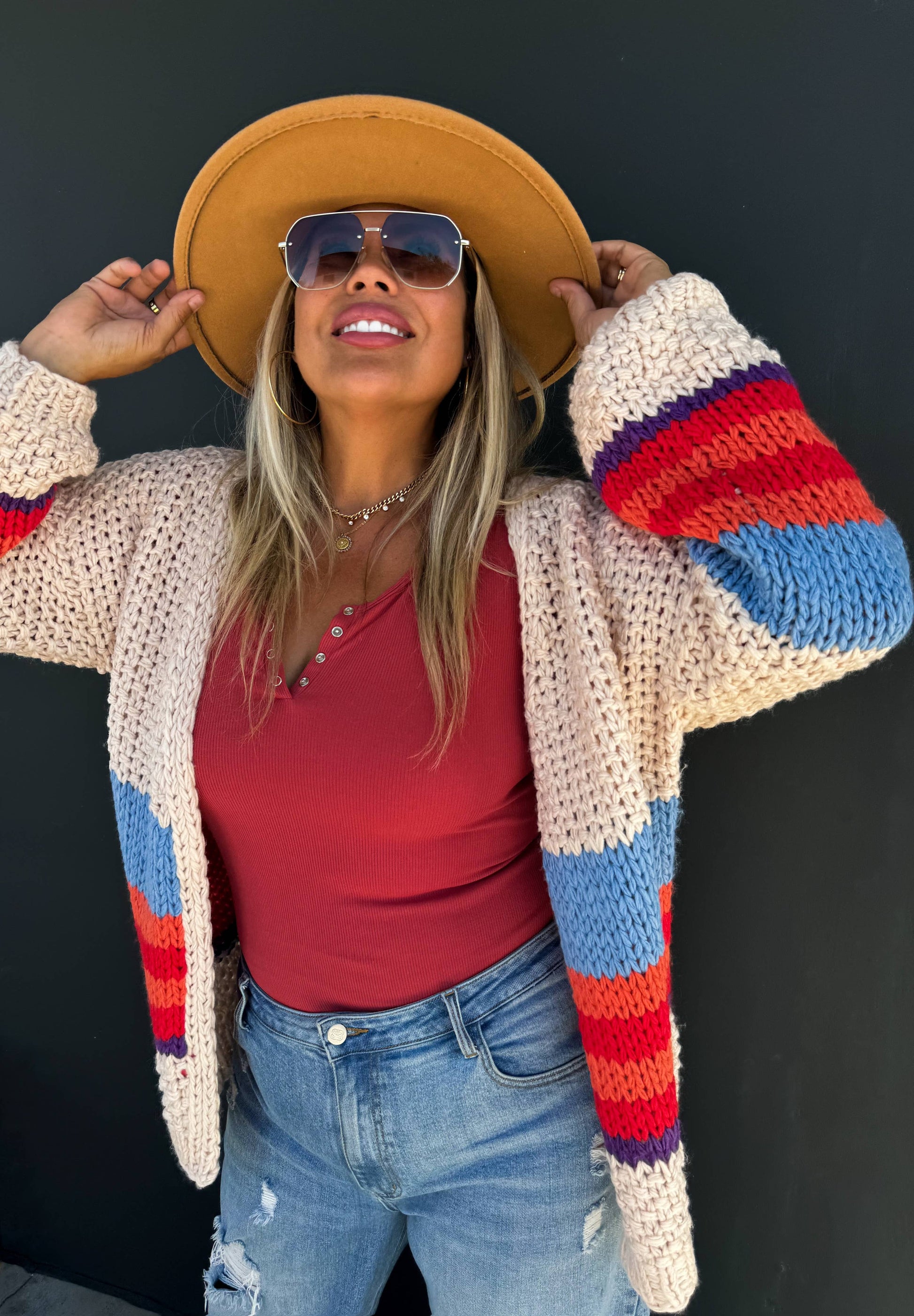 A statement layer made for cozy days and chic nights. This chunky knit cardigan features playful bubble sleeves, bold stripes, and a relaxed, stretchy fit that makes it the easiest throw-on piece in your closet.
