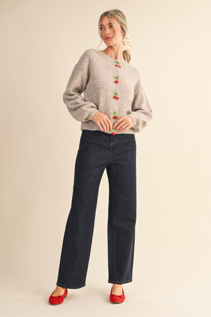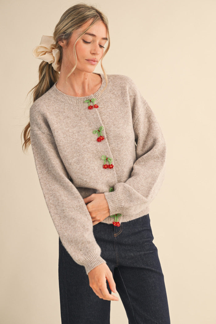 The Cherry On Top Cardigan is crafted from a soft marled knit and finished with hand-beaded cherry buttons—a sweet, elevated touch that sets this piece apart.