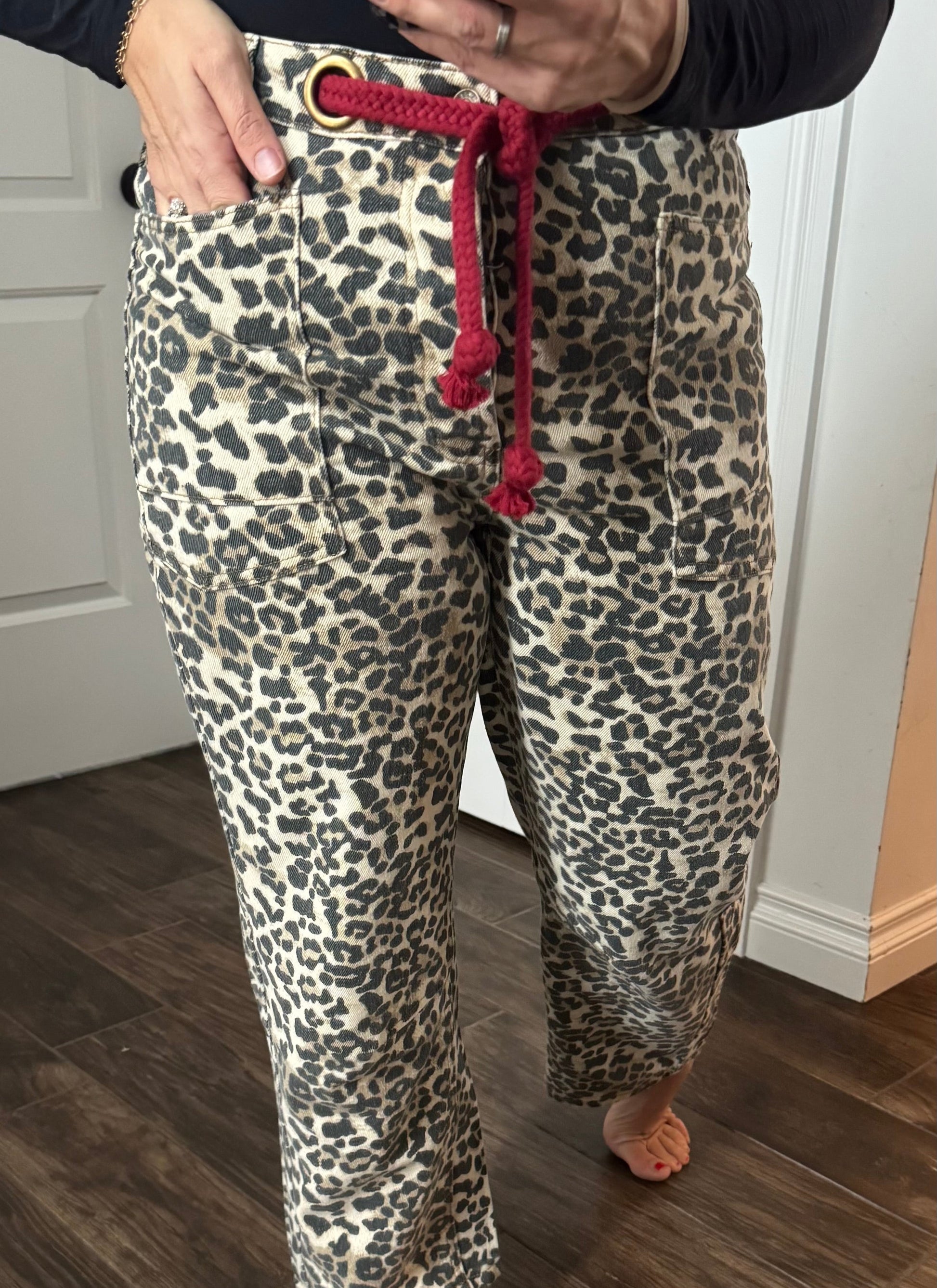 The Huntress leopard pant features a relaxed straight-leg fit, utility pocket details, and an adjustable rope waist. Bold yet wearable, this statement pant pairs effortlessly with fitted tops, knits, and layers.