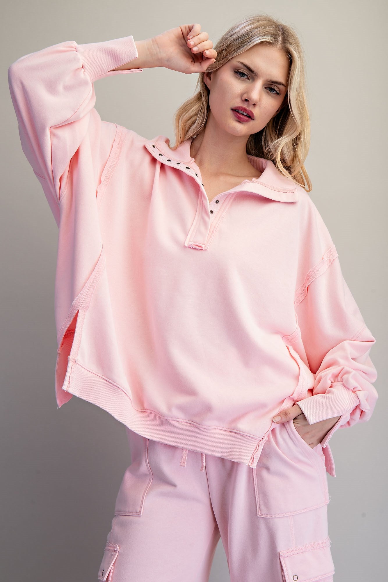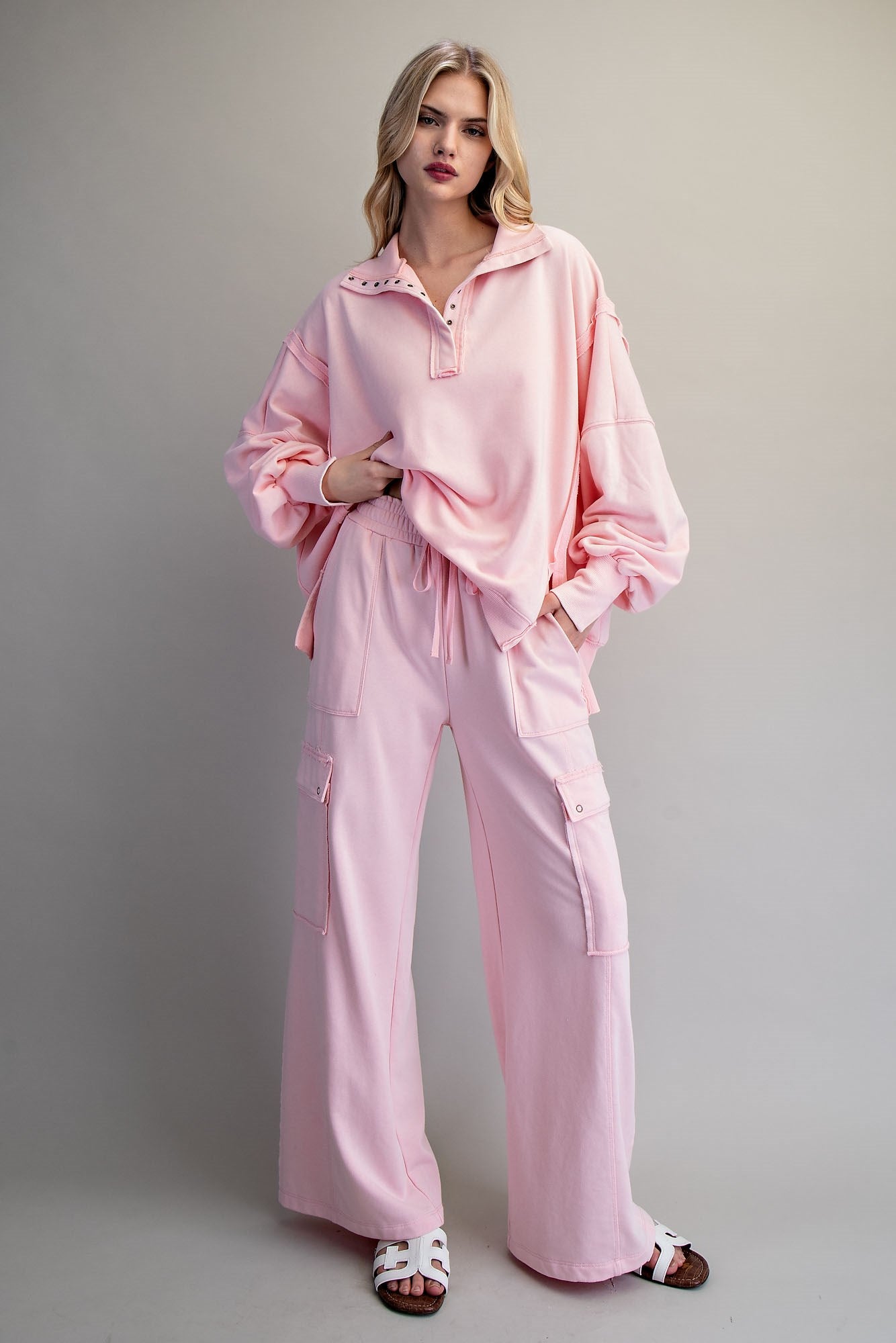 This set is a two-piece look featuring a snow-washed pullover paired with relaxed cargo sweatpants. With its soft structure, utility details, and easy silhouette, this set delivers that throw-it-on-and-go style while still looking intentionally put together.